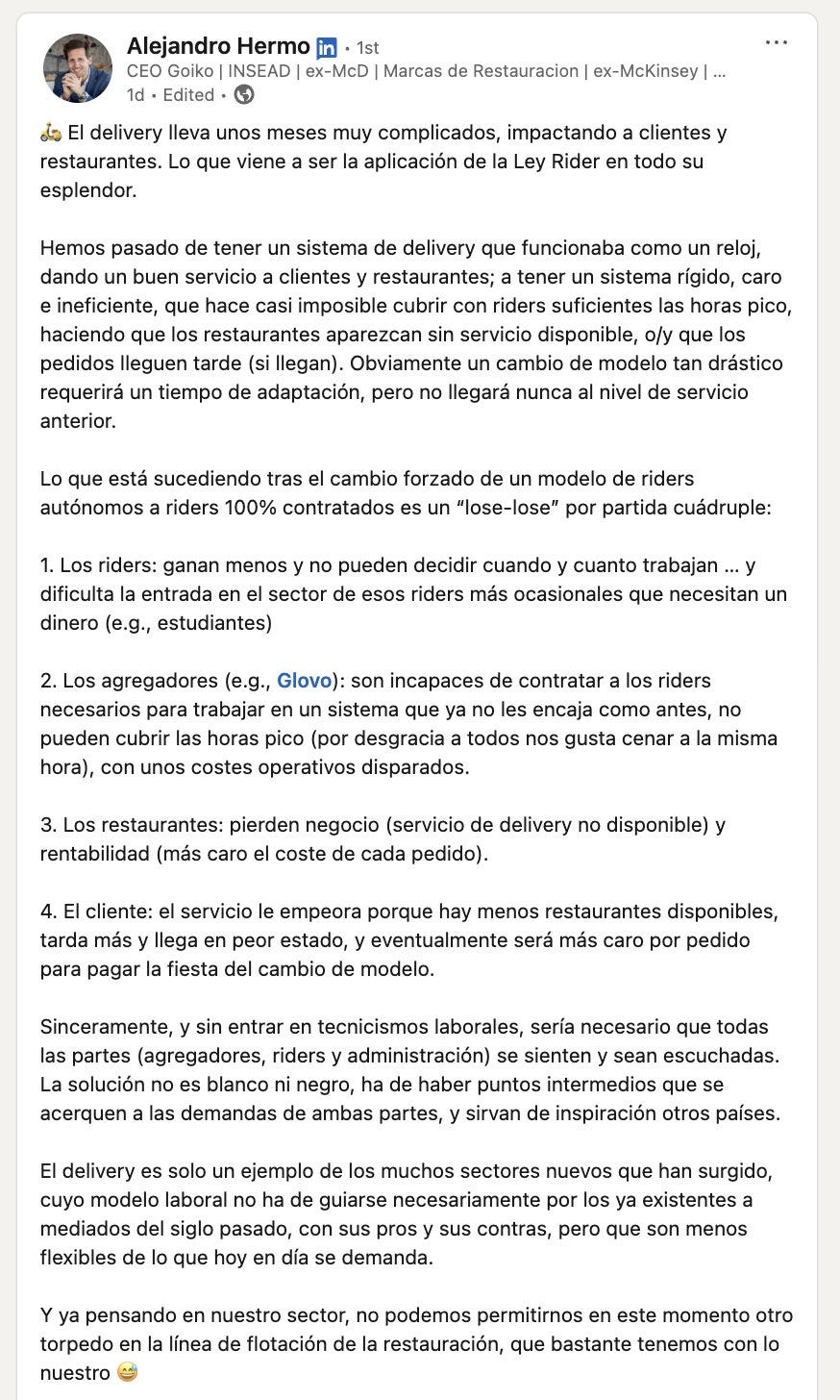 Alejandro Hermo, CEO of Goiko and previously at McDonalds and Burger King, lamented on LinkedIn that Spain’s rider law made delivery rigid and costly; he argues the system worked well until 2021 but now leads to lost orders, higher prices and lower rider income. Last week, it also known that Uber Eats may face criminal charges after Spain’s labour minister Yolanda Díaz accused it of still using bogus self‑employed riders. Uber insists its hybrid model complies with the law and offers riders choice.