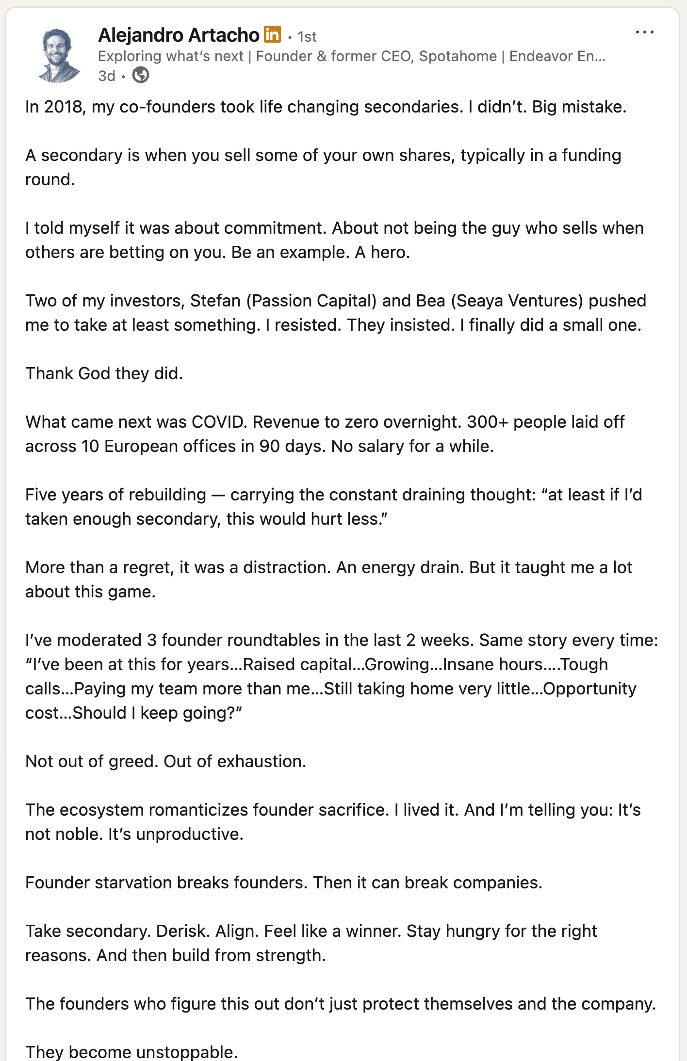 Alejandro Artacho, co-founder and former CEO of Spotahome, published a post on the importance of founder secondaries to be able to think long term: “In 2018, my co-founders took life changing secondaries. I didn’t. Big mistake.”