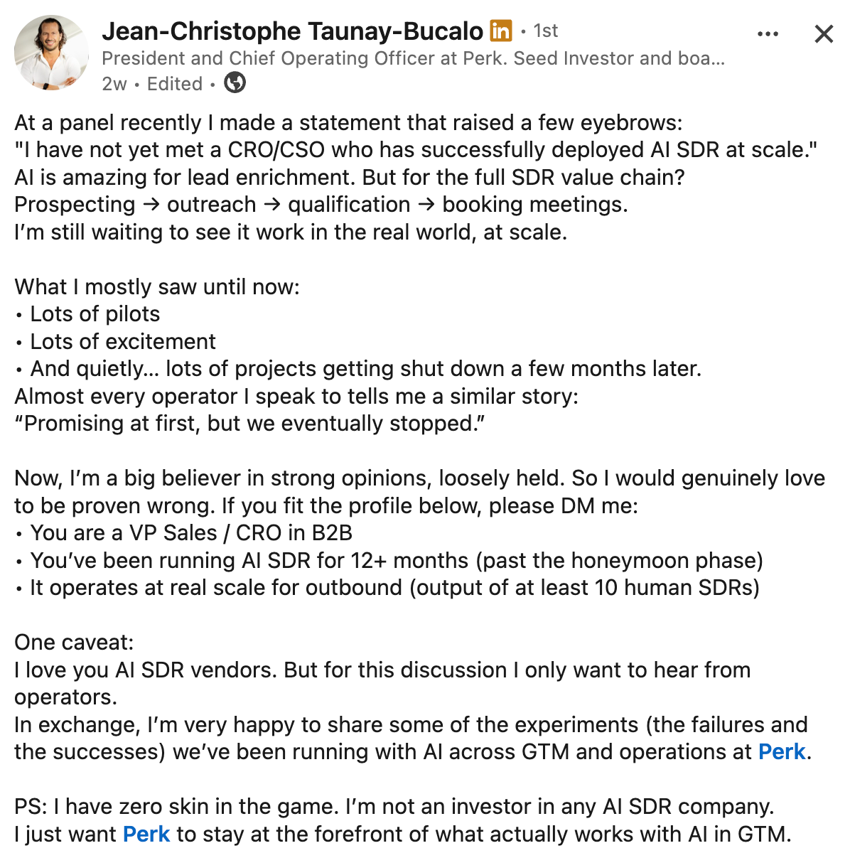 JC (COO at Perk) on whether companies are really launching AI SDR at scale and for the whole value chain. Interesting discussion in the comments